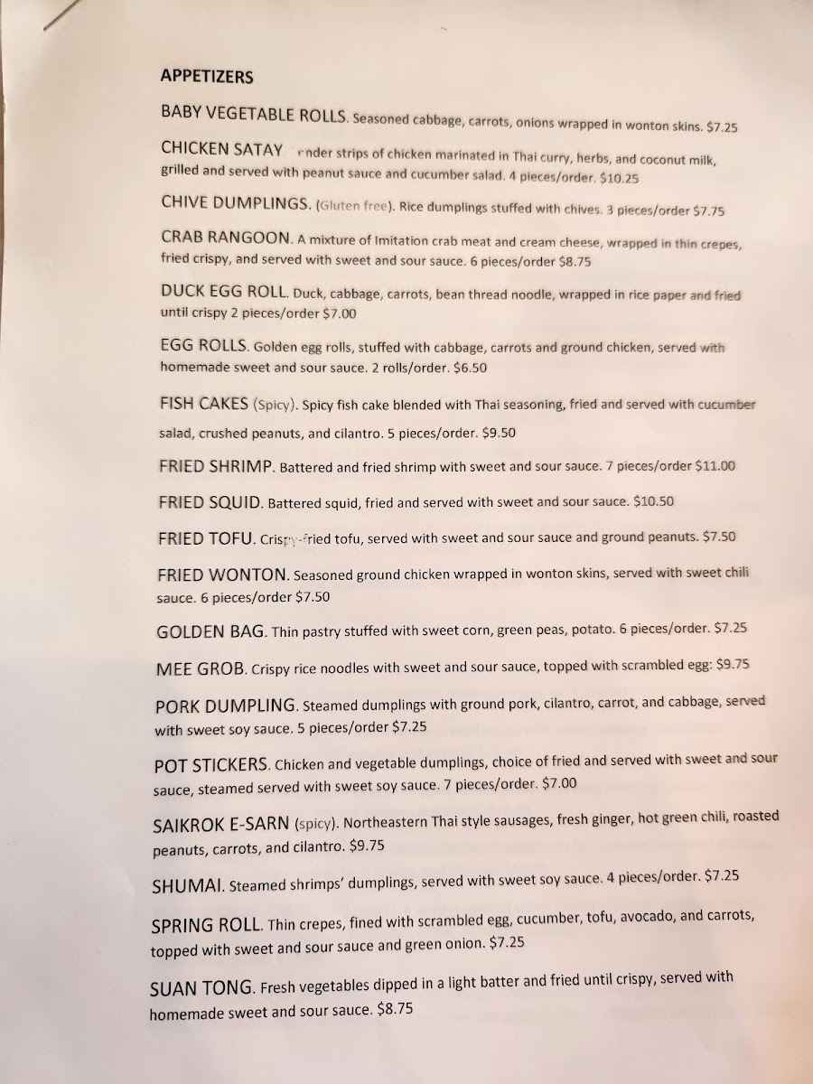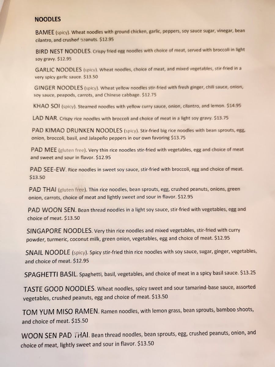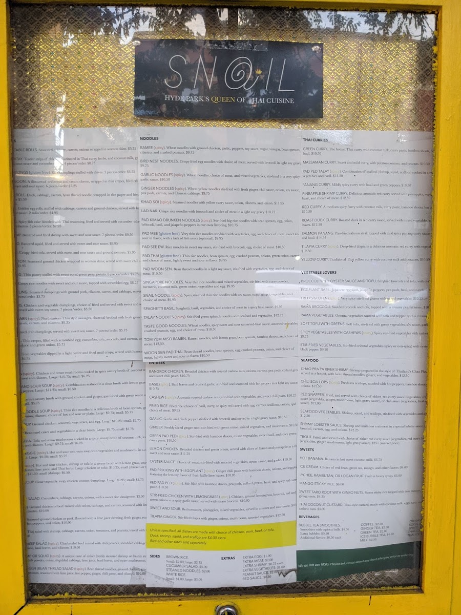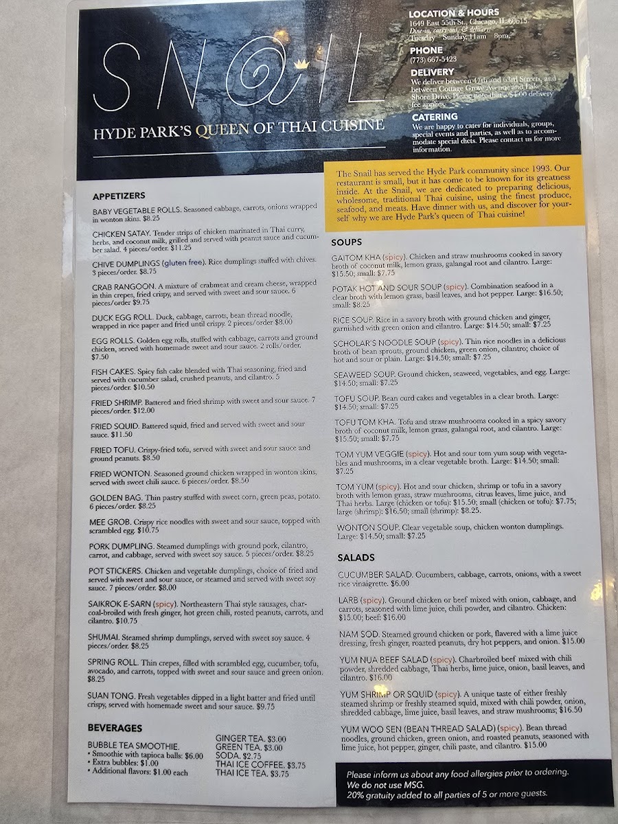 At Snail Thai Cuisine, each dish is crafted with love and packed with authentic Thai flavors, delivering an unforgettable dining experience. The Snail Thai Cuisine Menu is filled with traditional favorites, from vibrant curries to perfectly balanced stir-fries. Whether you're craving a comforting bowl of pad Thai, the heat of a spicy green curry, or the fresh taste of a papaya salad, you'll find something to excite your taste buds. The menu also features delicious appetizers and specialties, like crispy spring rolls and savory satays, all made with the freshest ingredients. Whether you're a long-time Thai food fan or new to the cuisine, this menu offers a delightful mix of flavors that will transport you straight to Thailand. With every bite, you're sure to enjoy a taste of the vibrant, rich culinary culture that defines Thai cooking.